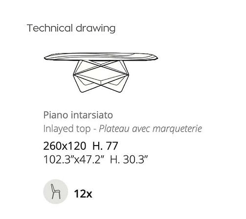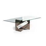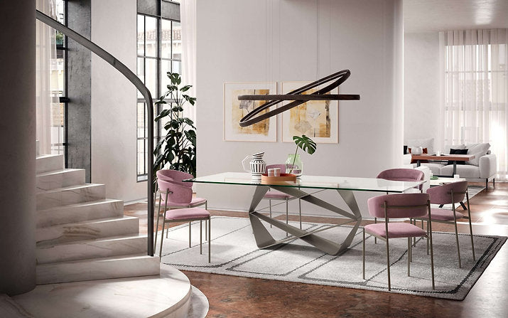 The simplicity of the different glass tops of the Gem table, with a double shaped beveled cross grinding edge and a straight ground polished edge, highlight the essential dynamism of the metal base in a double chromatic nuance or single color.
